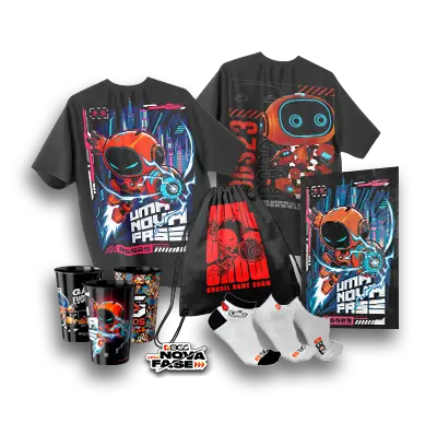 Kit com 1 Camiseta Oficial + 3 Copos + 3 Pares de Meia + 1 Pin + 1 Pôster + 1 Sacochila. E mais: 1 Camiseta Vintage da BGS exclusiva para quem comprar na pré-venda!